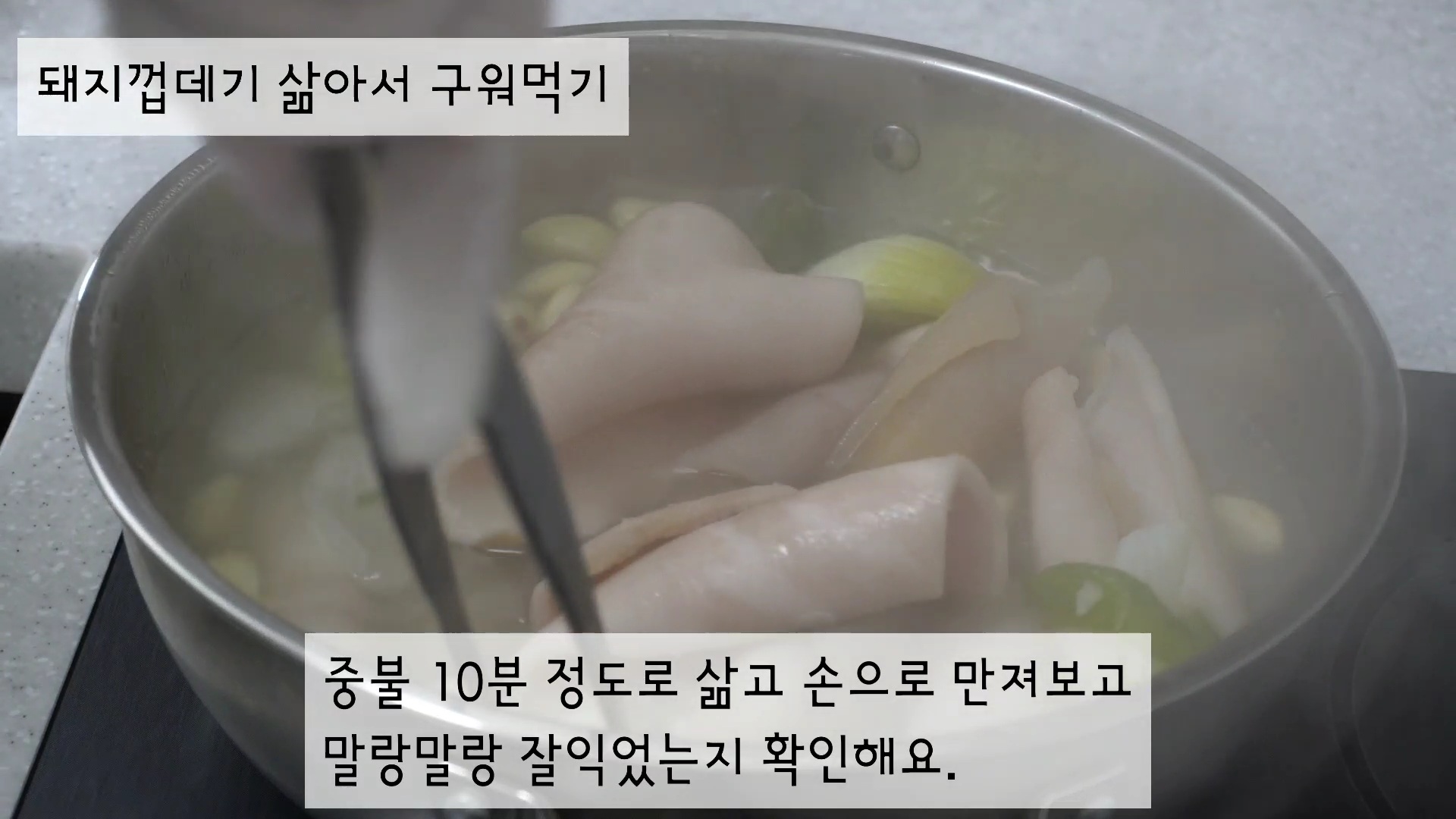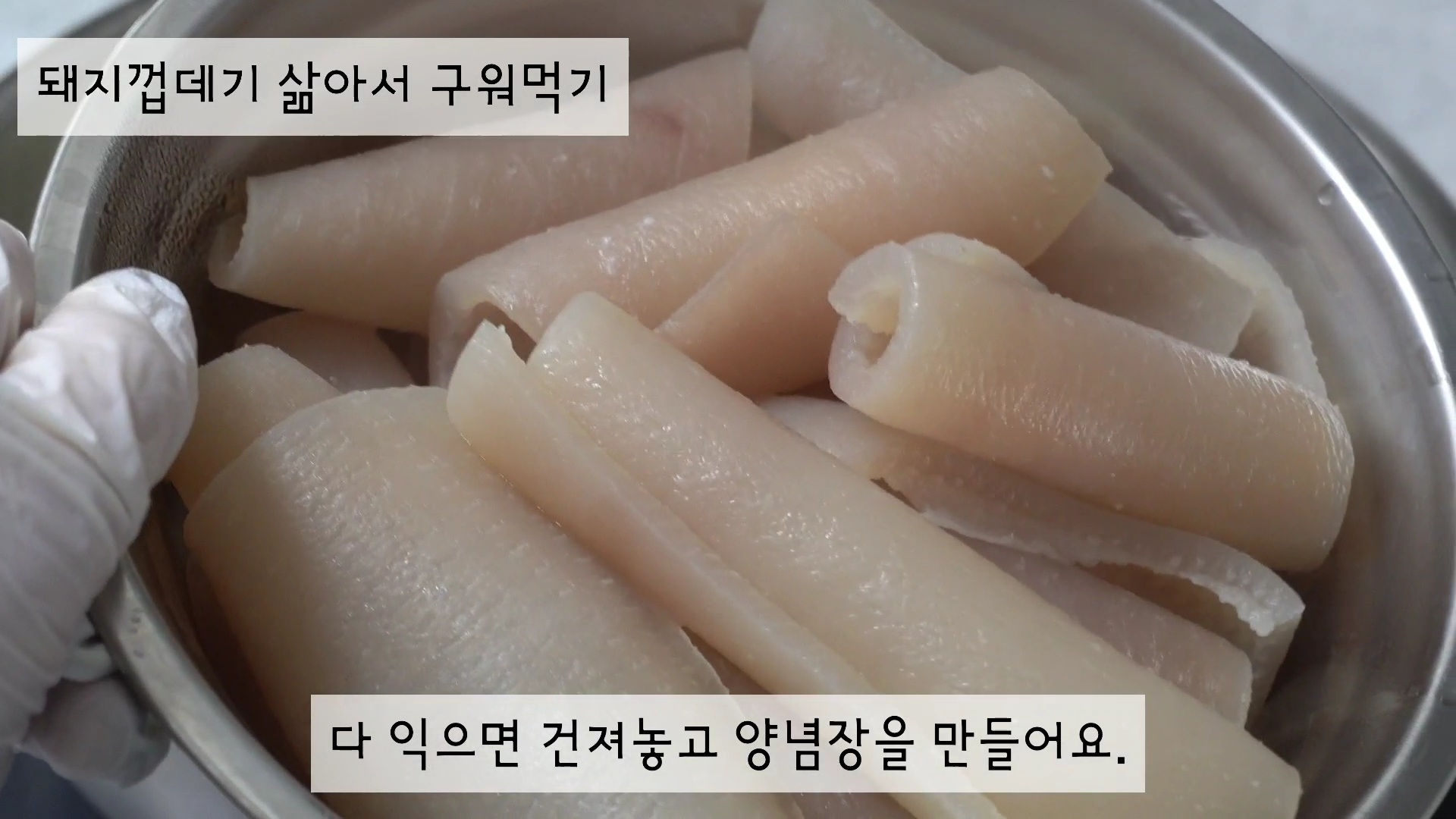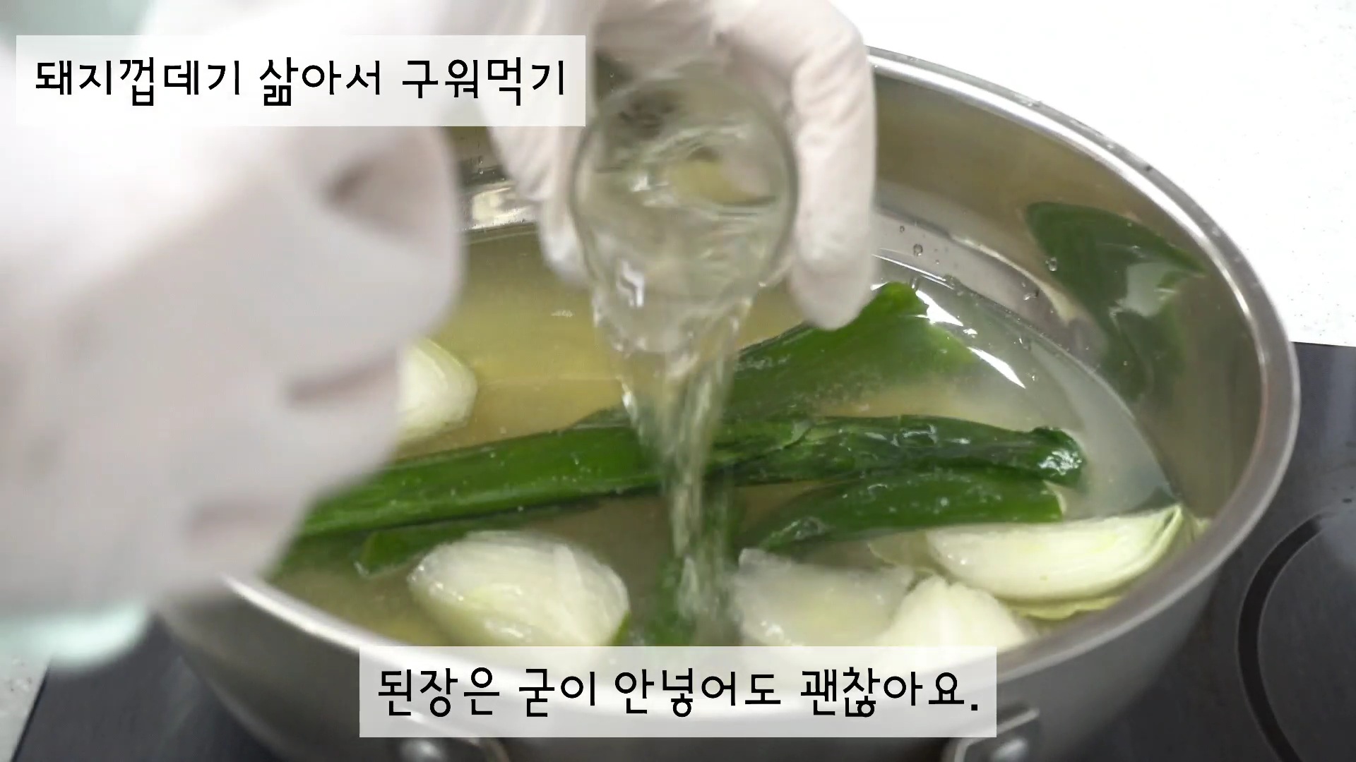 돼지껍데기를 삶으려면 물 1L와 소주 2잔도 넣어요.