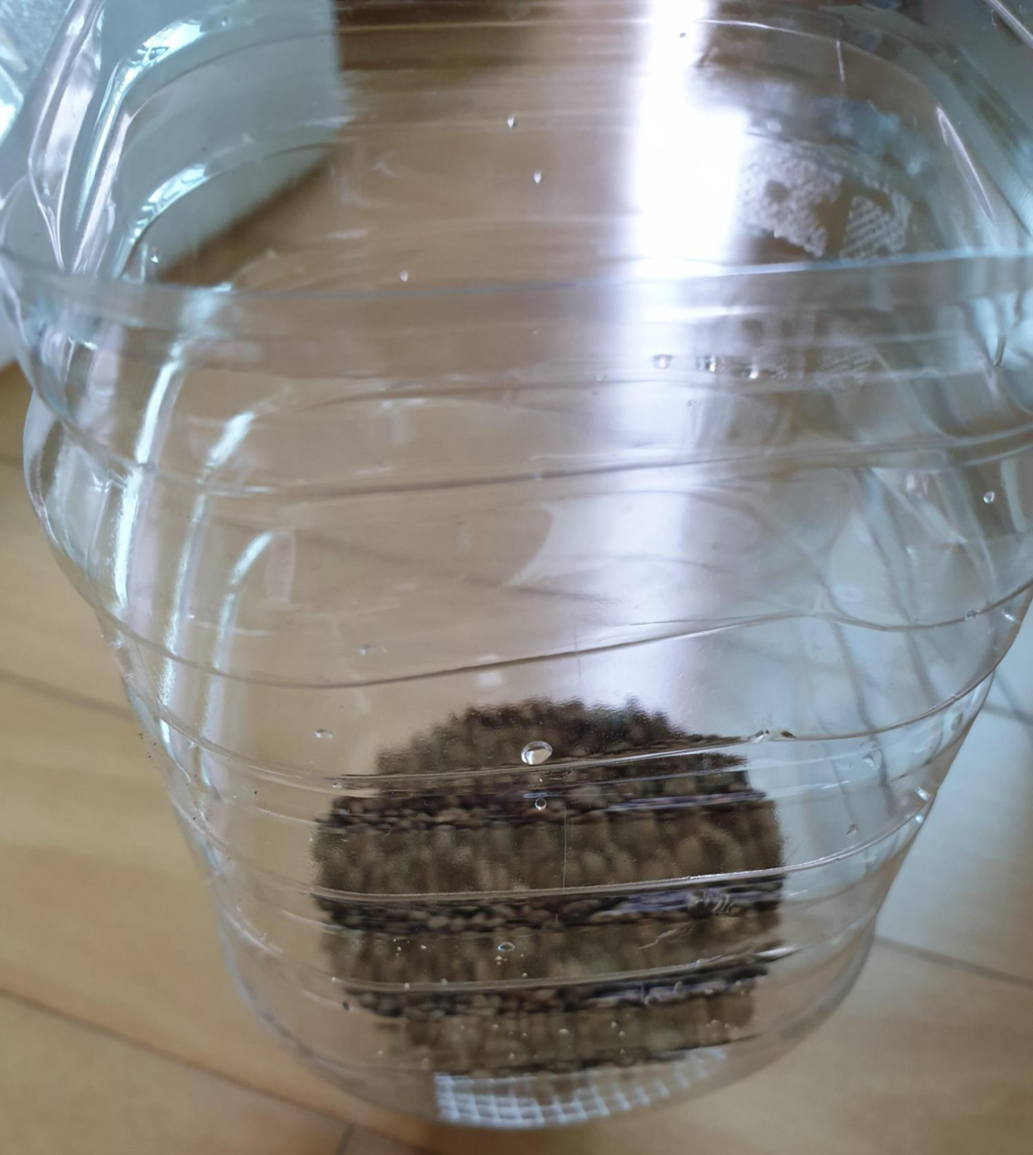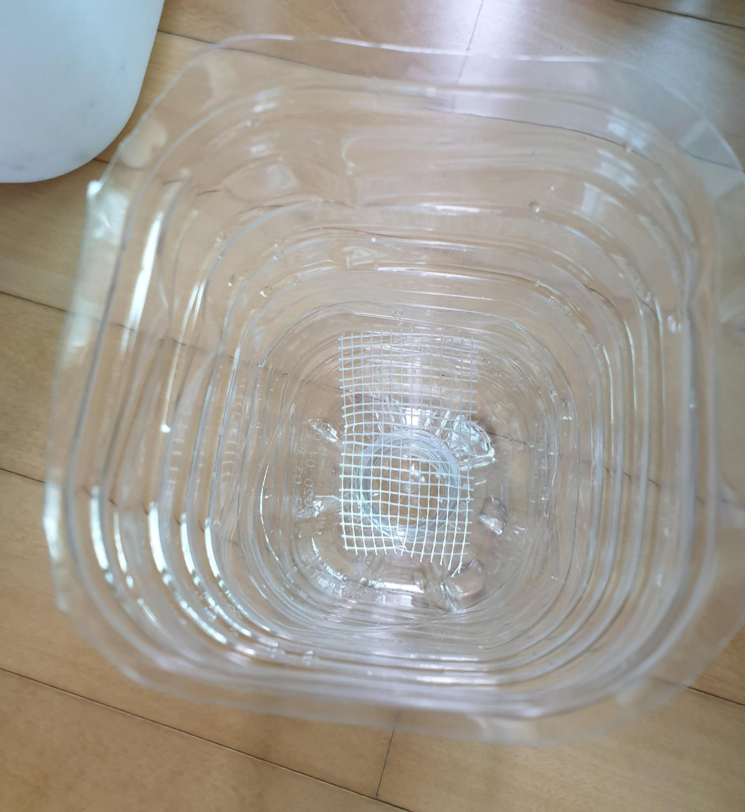 페트병을 반으로 잘라서 망사 테이프를 붙인 상태