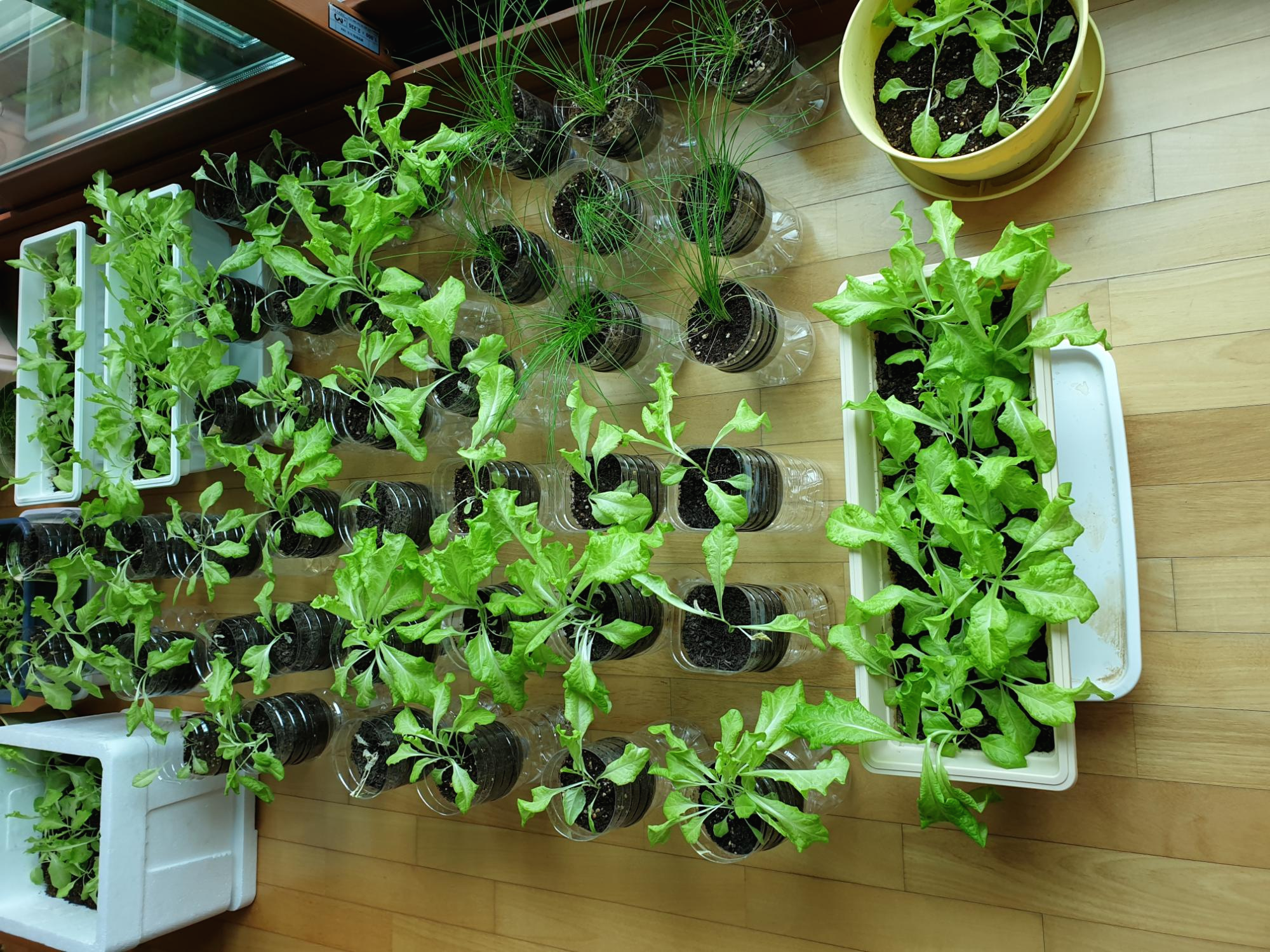 새싹이 자라고 나니까 화분이 모자라서 페트병을 재활용을 해봤어요.